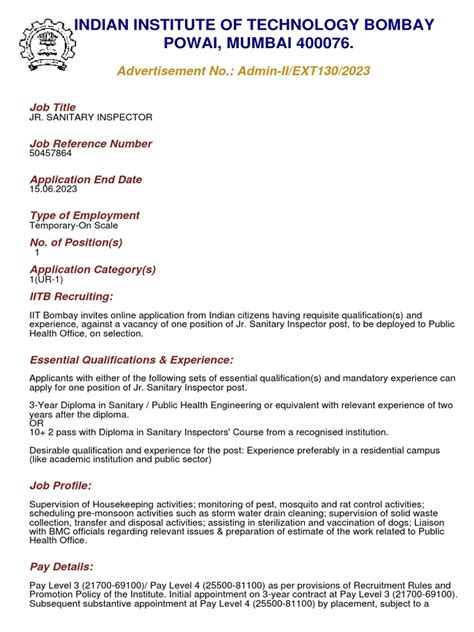 So, how do you determine if you meet the eligibility criteria? The first step is to carefully review the official job notification. This document will outline the specific requirements for each position, including the required educational qualifications, the minimum years of experience, and any other specific criteria. Make sure you read it thoroughly and ensure that you meet all the requirements before you apply. The IIT Bombay recruitment rules are designed to ensure that only the most qualified candidates are selected. Therefore, it’s essential to honestly assess your qualifications and only apply for positions where you meet the stated criteria. Applying for positions for which you are not eligible is a waste of your time and effort. Furthermore, be prepared to provide supporting documentation to verify your qualifications. This may include copies of your degrees, transcripts, certificates, and any other relevant documentation. Make sure you have all these documents ready and easily accessible when you apply. It’s also a good idea to seek advice from friends, mentors, or career advisors, who can review your application and provide you with valuable feedback. They can help you identify any areas where you might need to strengthen your application or provide suggestions for improving your chances of success. By thoroughly understanding the eligibility criteria and preparing your application carefully, you’ll be well on your way to securing a job at IIT Bombay. Good luck, you got this!