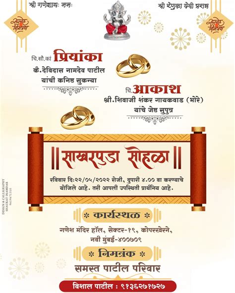 Now, let’s talk about the words, guys! The wording on a Marathi invitation card is where the heart of your invitation truly lies. It’s how you extend your warmth, respect, and excitement to your guests. A traditional opening often begins with a divine invocation, such as “|| श्री गणेशाय नमः ||” (Shri Ganeshaya Namaha), meaning “Salutations to Lord Ganesha,” or “|| श्री राम जय राम ||” (Shri Ram Jai Ram), seeking blessings for a smooth and auspicious start. This sets a pious and traditional tone right away. Following this, you’ll need a clear statement of invitation. For a wedding, a common and respectful phrasing would be: “आमंत्रित करती आहे” (Aamantrit karti aahe - inviting) or “स्नेहादराने आमंत्रित करीत आहोत” (Snehadaraane aamantrit karith aahot - inviting with affection). You then clearly state the names of the parents or hosts extending the invitation, followed by the names of the couple getting married. For example: “श्री. [वडिलांचे नाव] आणि सौ. [आईचे नाव] यांच्या सुपुत्रास/सुपुत्रीस, [वधूचे नाव] यांचा विवाह, [वरचे नाव] यांच्या सुपुत्री/सुपुत्रासोबत संपन्न होत आहे.” (Shri. [Father’s Name] and Sau. [Mother’s Name] invite you to the marriage of their son/daughter [Bride’s Name] with the son/daughter of [Groom’s Name]). This structure is classic and ensures all key relationships are acknowledged. When it comes to event details, be crystal clear. State the date: “दिनांक [Day] [Month] [Year]” (Dinank [Day] [Month] [Year]), the day: “[Day of the Week] वार” ([Day of the Week] Vaar), and the time: “वेळ [Time] वाजता” (Vel [Time] Vajata). For the venue, provide the full name and address: “स्थळ: [Venue Name], [Full Address], [City].” If you’re having a reception or other functions, list them separately with their respective dates, times, and venues. Don’t forget the RSVP details! Usually, a line like “आपली उपस्थिती प्रार्थनीय” (Aapli upasthiti prarthaniya - Your presence is requested) or “सहकुटुंब सहपरिवार उपस्थित राहावे” (Sahakutumb sahaparivar upasthit rahave - Kindly attend with family) is included. For contact, you might add: “संपर्क: [Name], [Phone Number].” Sometimes, a small, heartfelt blessing or quote is added at the end, reinforcing the joyous nature of the event and wishing the couple well. The language should be respectful, warm, and clear, ensuring every guest feels genuinely invited and important.