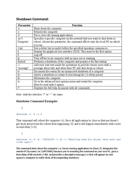 switch specifically tells it to initiate a shutdown. This is your go-to for a quick, clean power-off. But what if you need a bit more notice? Maybe you’ve got a download running or want to give other users on the network a heads-up? This is where the time delay parameter comes into play. You can specify a delay in seconds, like